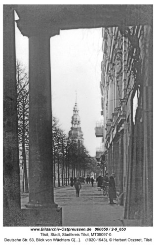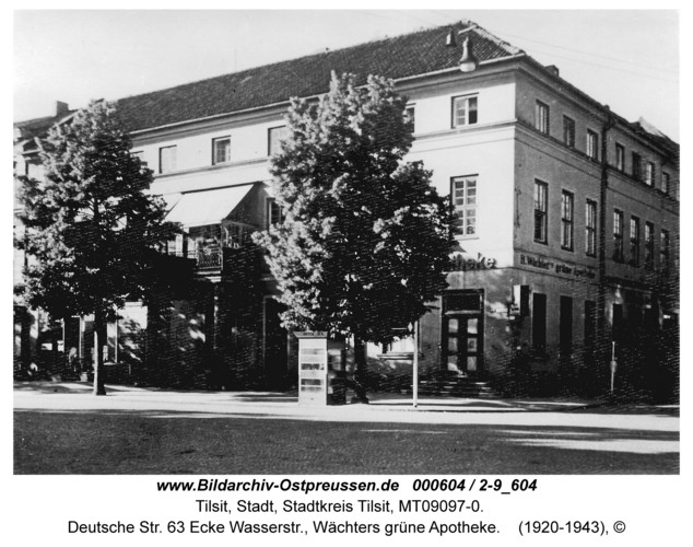 В доме № 63, на углу Вассерштассе( Мамина-Сибиряка), построенном строительным мастером Вернером, по мнению Дефлетсена, в 1824 году, уже с середины 19 века помещалась «Зеленая» аптека владельца Вахтерса. Две крупные колоны дорического типа, выступающие на тротуар и поддерживающие балкон, стали «знаковыми» для Дойчештрассе - ни одно здание на этой улице не имело столь смелое архитектурное решение.