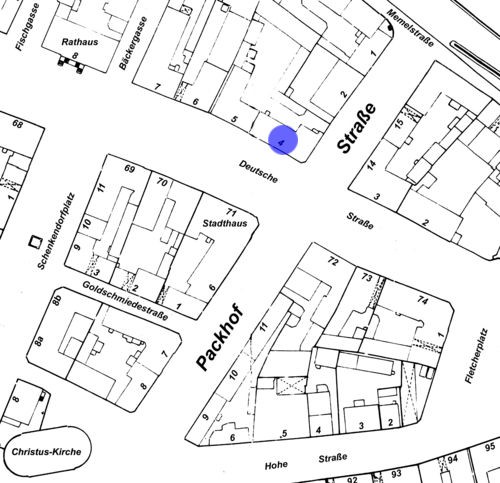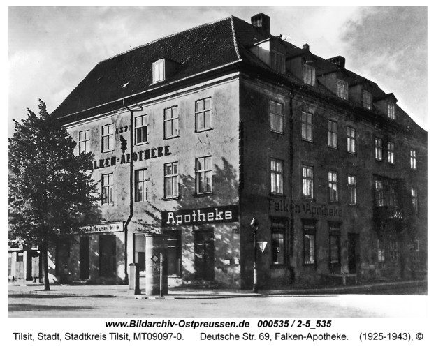 Дом № 69 на углу Дойчештрассе и площади Шакендорфплац, где находилась «Фалькен – Аптека» построен в 1700 году, считался самым старым зданием Тильзита, поскольку отдельные части этого дома относились к постройкам 1571 года.