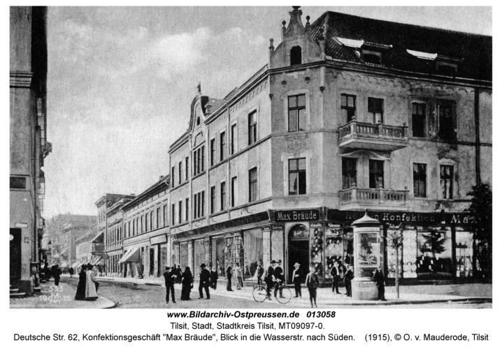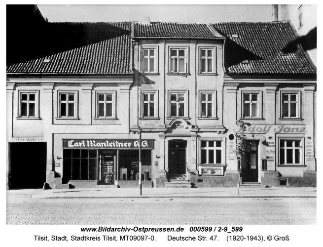 Дом № 51 - булочная Берендта. В этом месте улица преображалась и начиналось лирическое отступление в…. Италию. О чем свидетельствовало барокальное здание с дробным фронтоном, пилястрами и неизбежными валютами по краям, в миниатюре напоминавшее фасад римской церкви Иль Джезу («Во имя Иисуса») Здание, по мнению Дефлетсена, построено около 1700 года и было не только украшением города Тильзита, и охраняемым памятником архитектуры.